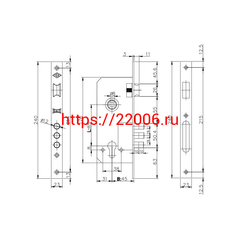 - Корпус Kale kilit (Кале килит) врезного замка с защёлкой 152/3MR (45 mm) w/b (никель) в Кургане недорого
