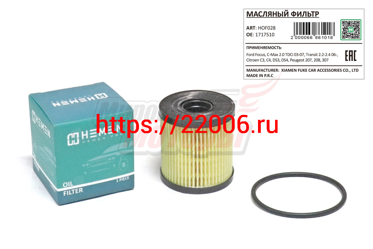- Фильтр масляный Ford Focus, C-Max 2.0 TDCi 03-07, Transit 2.2-2.4 06-, Citroen C3, C4, DS3, DS4, Peugeot 207, 208, 307 (HOF028) в Кургане недорого