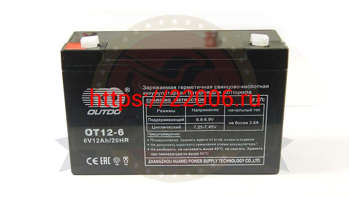 - Аккумулятор 6В 12 А/ч, кислотный AGM OТ12-6, OUTDO (151х51х94х100по_клеммам) прямая пол. в Кургане недорого